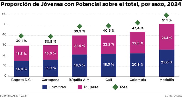 En Barranquilla, las mujeres son mayoría entre los jóvenes con potencial, situación que sucede en el resto de ciudades analizadas. Esto refleja: