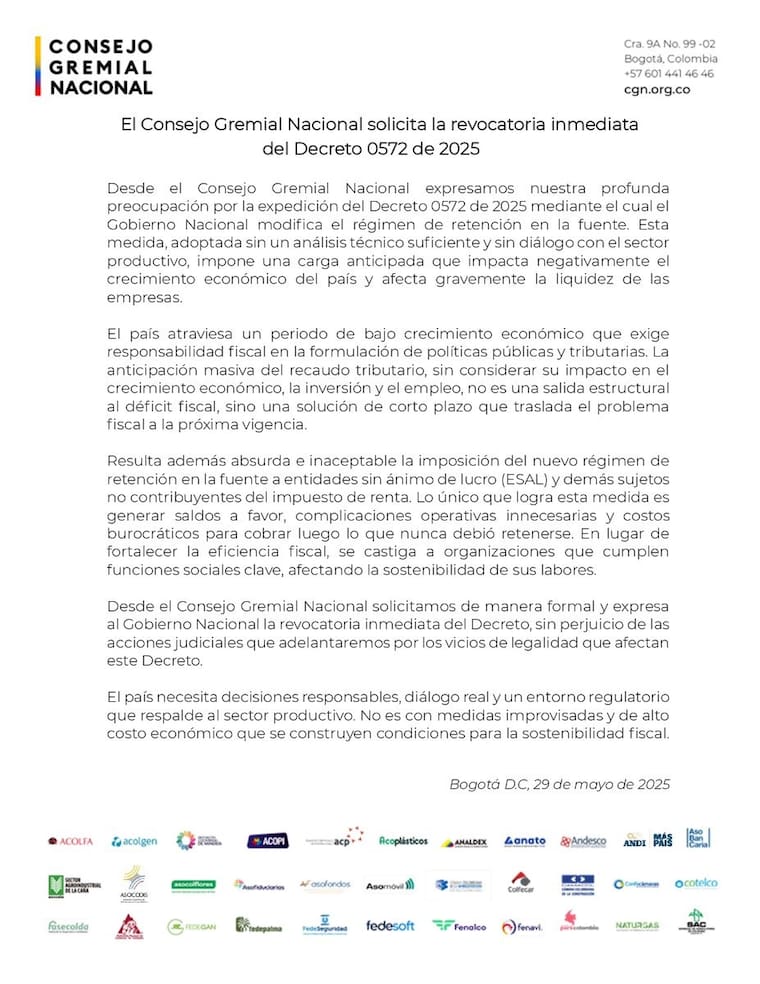 “Expresamos nuestra profunda preocupación por la expedición del Decreto 0572 (...), que impone una carga anticipada que impacta negativamente el crecimiento económico del país y afecta gravemente la liquidez de las empresas”, señaló el Consejo en un comunicado oficial.