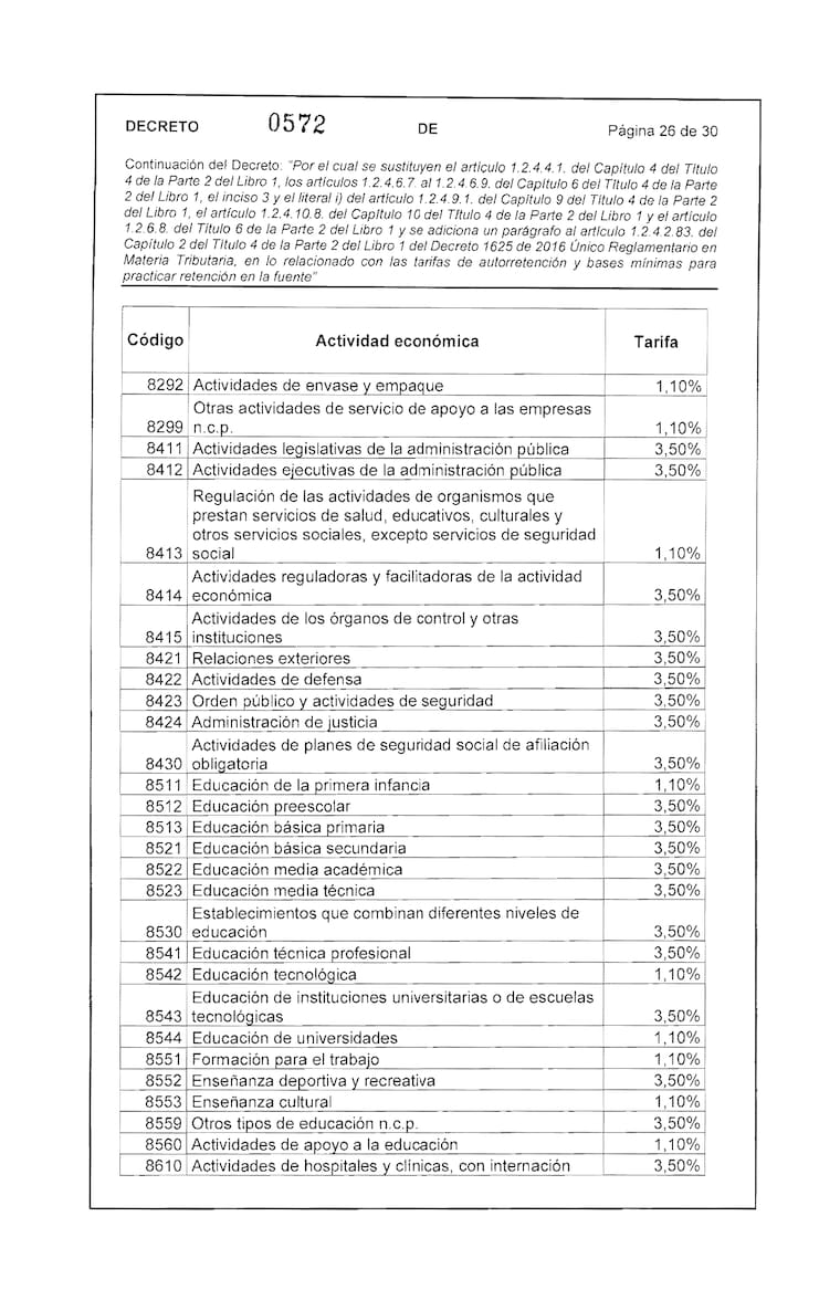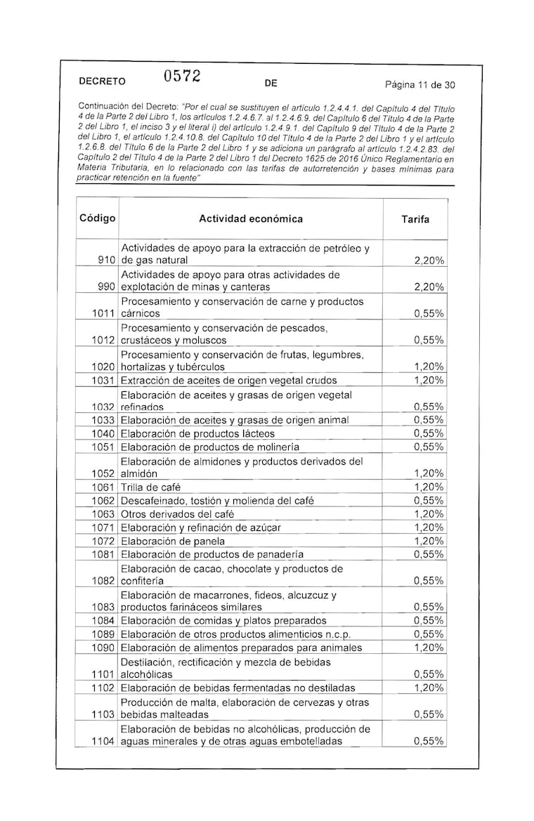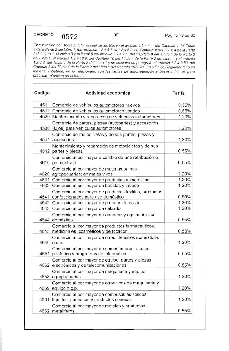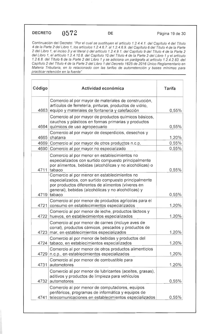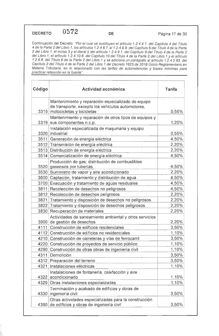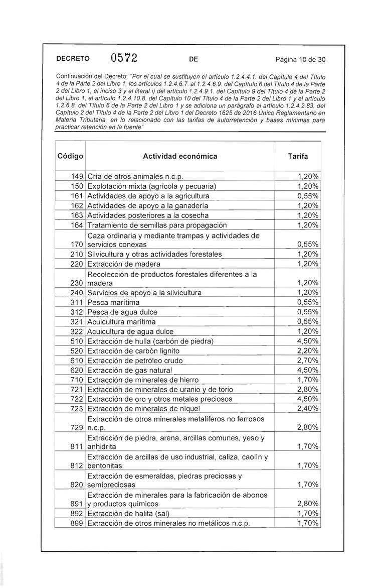 Las actividades económicas que tendrán más autorretención en la fuente, con una tarifa de 4,5 %, serán: extracción de hulla (carbón de piedra), extracción de gas natural, extracción de oro y otros metales preciosos, generación de energía eléctrica, comercialización de energía eléctrica, producción de gas; distribución de combustibles gaseosos por tuberías; captación, tratamiento y distribución de agua, evacuación y tratamiento de aguas residuales y recolección de desechos no peligrosos.