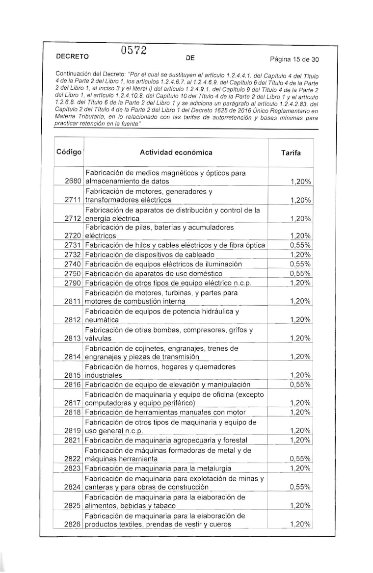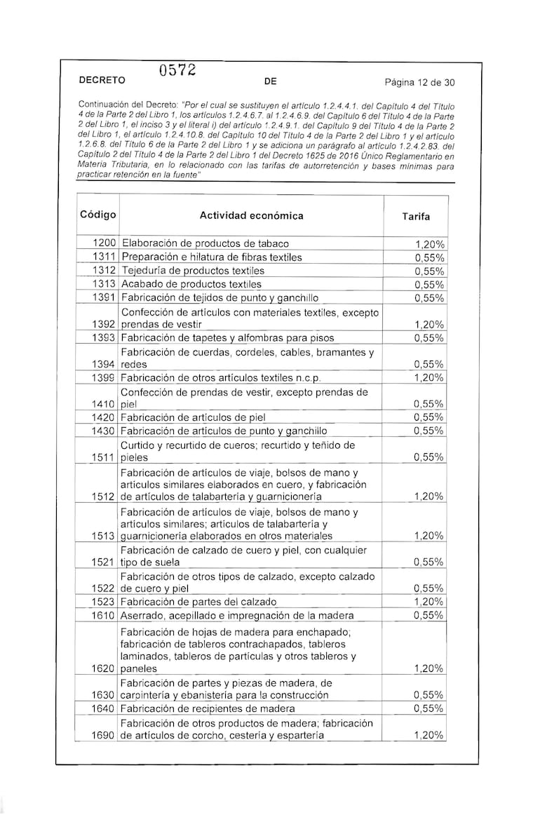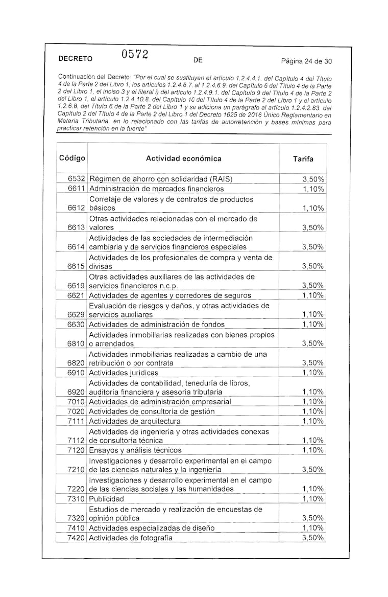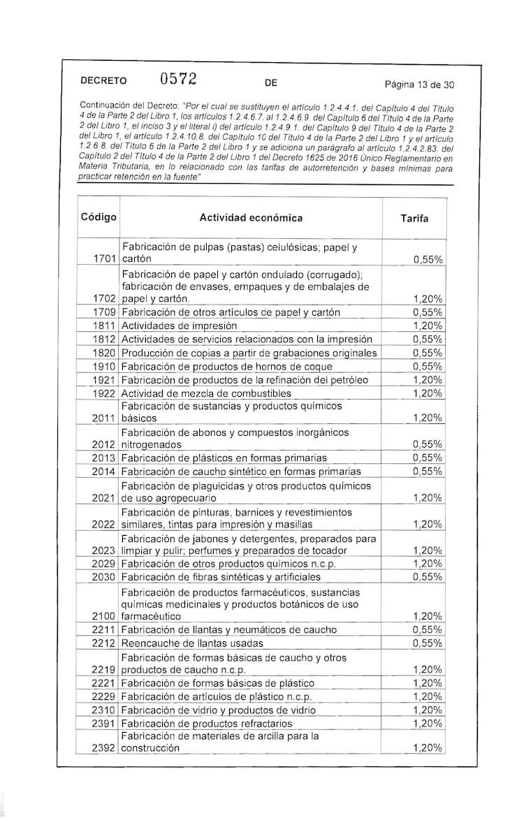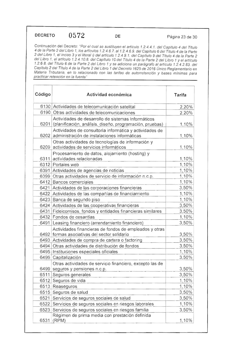 Las actividades económicas que tendrán más autorretención en la fuente, con una tarifa de 4,5 %, serán: extracción de hulla (carbón de piedra), extracción de gas natural, extracción de oro y otros metales preciosos, generación de energía eléctrica, comercialización de energía eléctrica, producción de gas; distribución de combustibles gaseosos por tuberías; captación, tratamiento y distribución de agua, evacuación y tratamiento de aguas residuales y recolección de desechos no peligrosos.