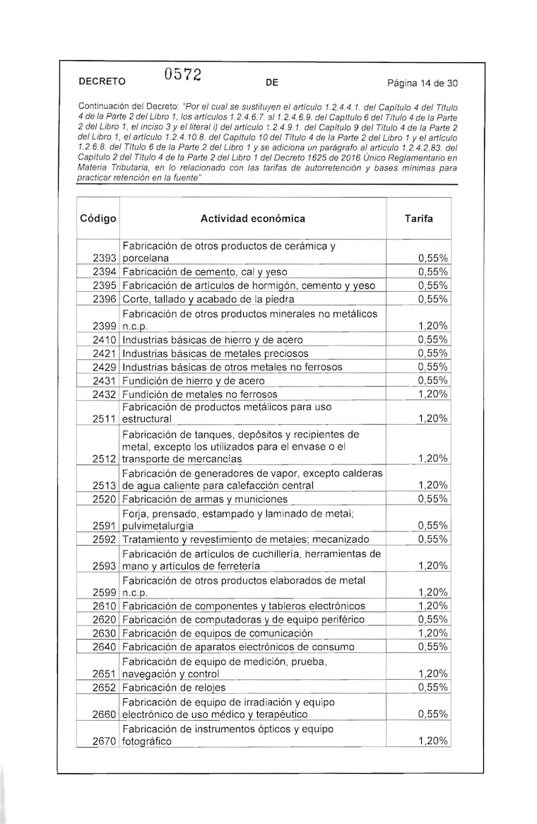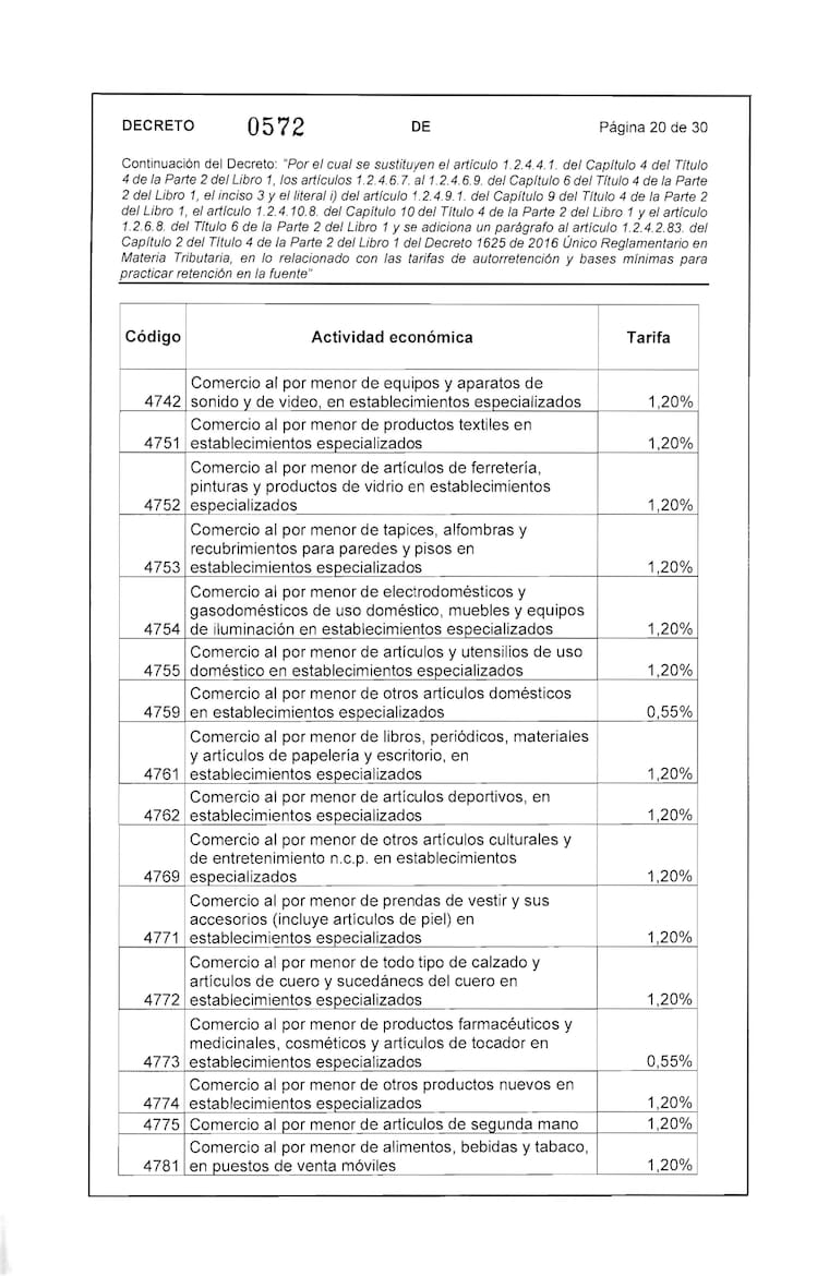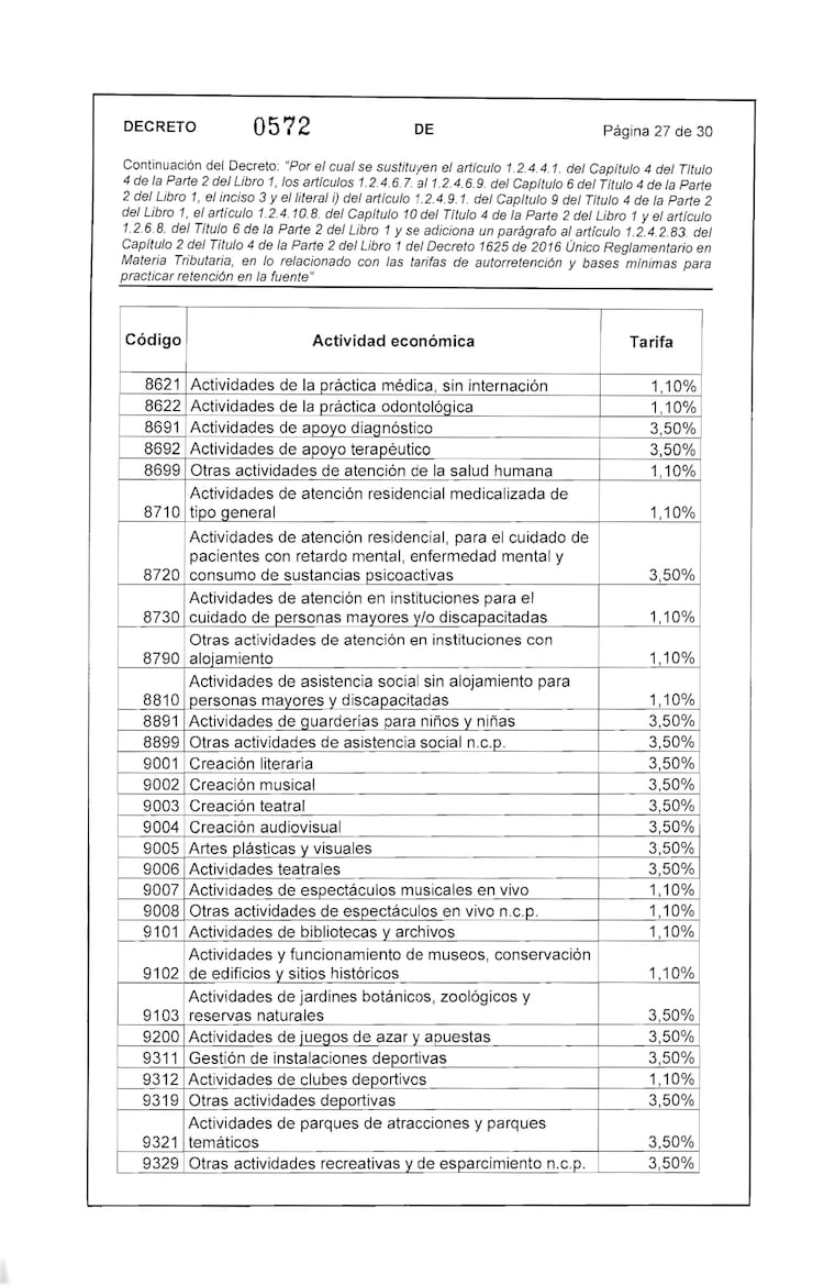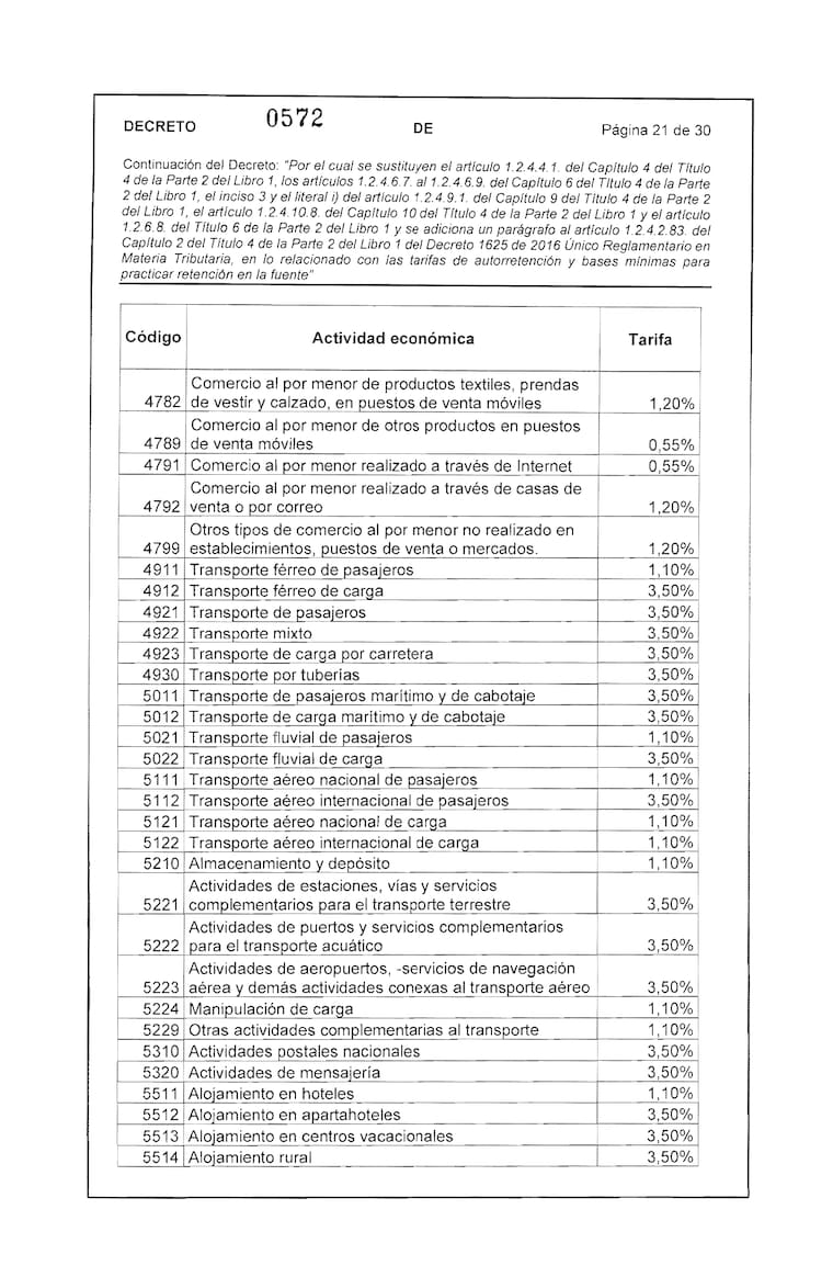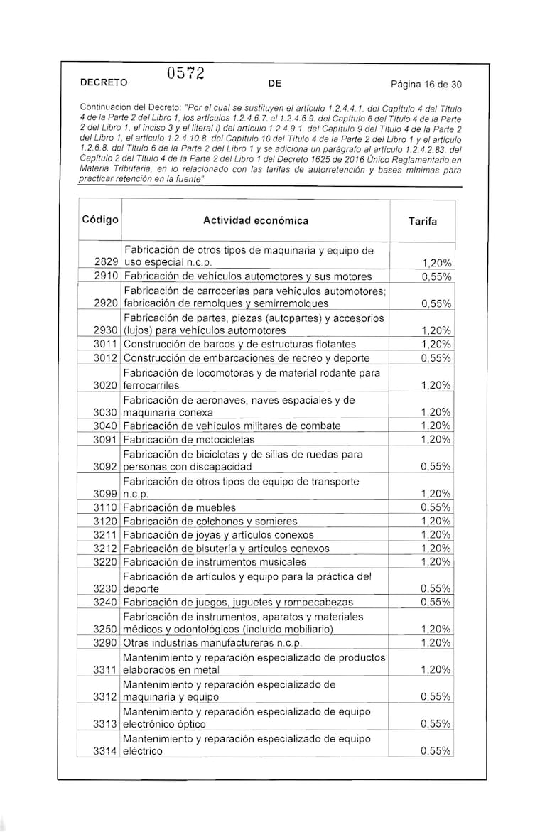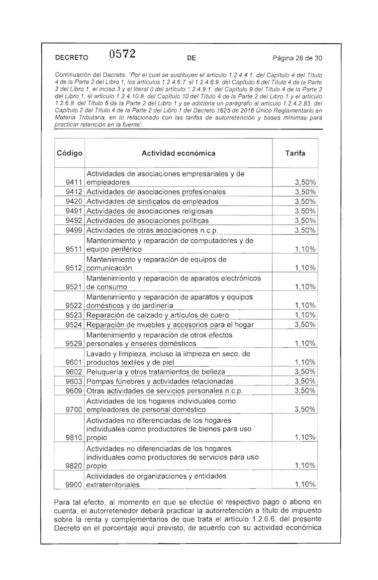 Las actividades económicas que tendrán más autorretención en la fuente, con una tarifa de 4,5 %, serán: extracción de hulla (carbón de piedra), extracción de gas natural, extracción de oro y otros metales preciosos, generación de energía eléctrica, comercialización de energía eléctrica, producción de gas; distribución de combustibles gaseosos por tuberías; captación, tratamiento y distribución de agua, evacuación y tratamiento de aguas residuales y recolección de desechos no peligrosos.