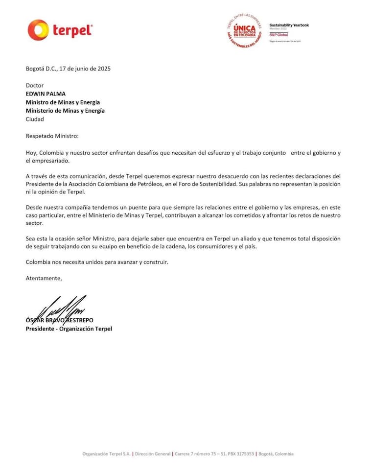 Frente a ello, la compañía se pronunció a través de una carta enviada al ministro de Minas y Energía, Edwin Palma, y subrayó que estas “no representan la posición ni la opinión” de la compañía, pese a que hace parte de la ACP.