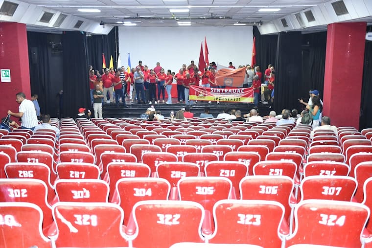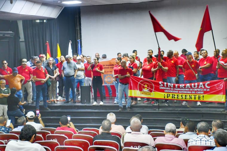 Diferentes sindicatos de los trabajadores de la Universidad Autónoma del Caribe se tomaron el recinto del Teatro Mario Ceballos Araujo, donde se iba a llevar a cabo el foro ‘Estado Social de Derecho y las Reformas Sociales’, en protesta por el deterioro que, ellos indican, presenta esta alma mater.