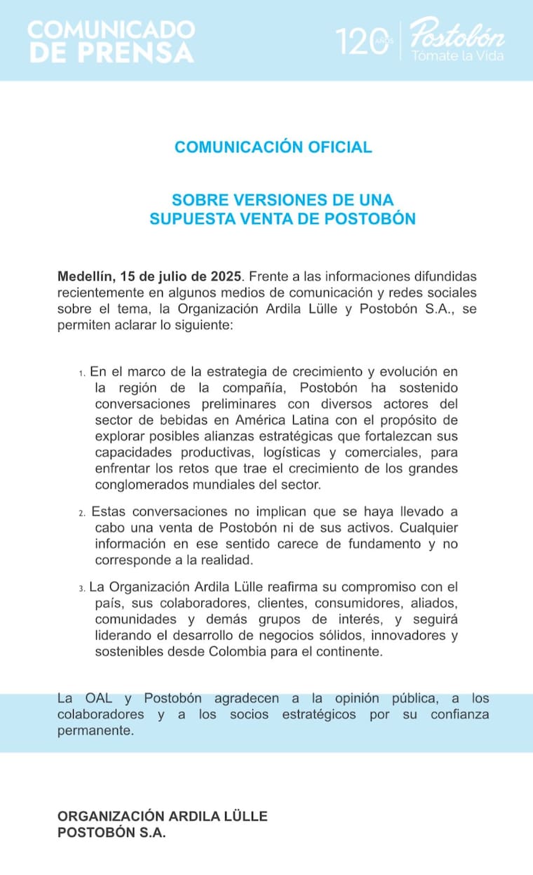 “En el marco de la estrategia de crecimiento y evolución en la región de la compañía, Postobón ha sostenido conversaciones preliminares con diversos actores del sector de bebidas en América Latina con el propósito de explorar posibles alianzas estratégicas que fortalezcan sus capacidades productivas, logísticas y comerciales, para enfrentar los retos que trae el crecimiento de los grandes conglomerados mundiales del sector”, dice el comunicado.
