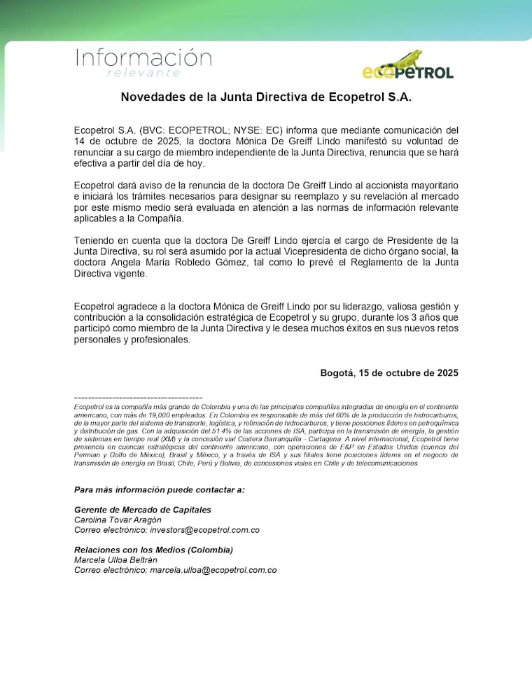 “Ecopetrol dará aviso de la renuncia de la doctora De Greiff Lindo al accionista mayoritario e iniciará los trámites necesarios para designar su reemplazo y su revelación al mercado por este mismo medio será evaluada en atención a las normas de información relevante aplicables a la compañía”, indicó la empresa.