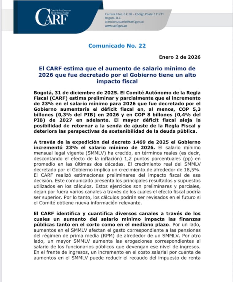 Asimismo, en un comunicado emitido este 2 de enero, se lee que los “cálculos preliminares y parciales del Carf indican que el efecto el aumento en el SMMLV aumentará el déficit fiscal de 2026 en, por lo menos, COP 5,3 billones (0,3% del PIB) y COP 8 billones (0,4% del PIB) de 2027 en adelante”.