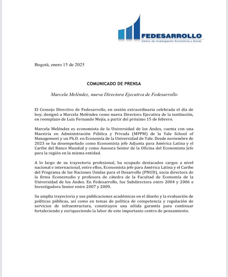 “Marcela Meléndez es economista de la Universidad de los Andes, cuenta con una Maestría en Administración Pública y Privada (MPPM) de la Yale School of Management y un Ph.D. en Economía de la Universidad de Yale. Desde noviembre de 2023 se ha desempeñado como Economista jefe Adjunta para América Latina y el Caribe del Banco Mundial y como Asesora Senior de la Oficina del Economista Jefe para la región en la misma entidad”, se lee en el comunicado de la entidad.