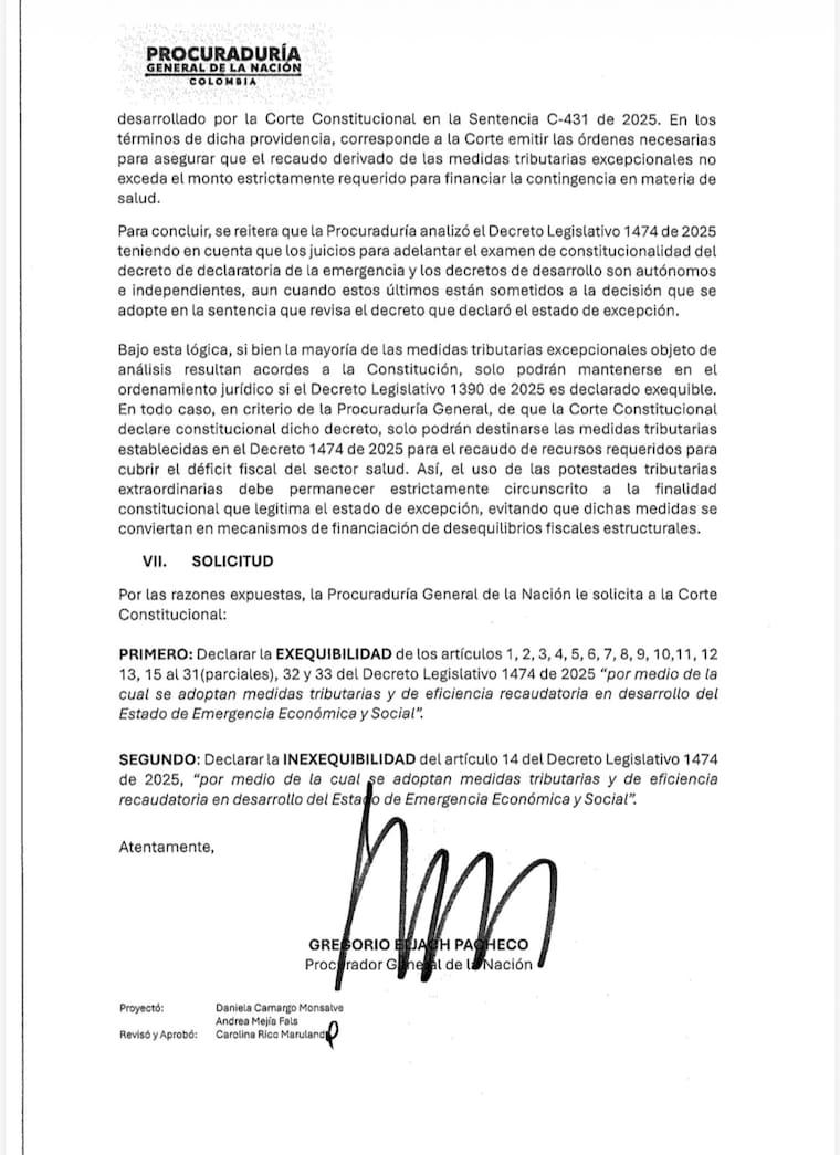 El documento, firmado por el procurador general Gregorio Eljach Pacheco, concluye que la mayoría de las medidas tributarias excepcionales analizadas se ajustan a la Constitución, aunque su permanencia en el ordenamiento dependería de que también sea declarado exequible el Decreto Legislativo 1390 de 2025, que sirvió de base para la declaratoria de la emergencia.​