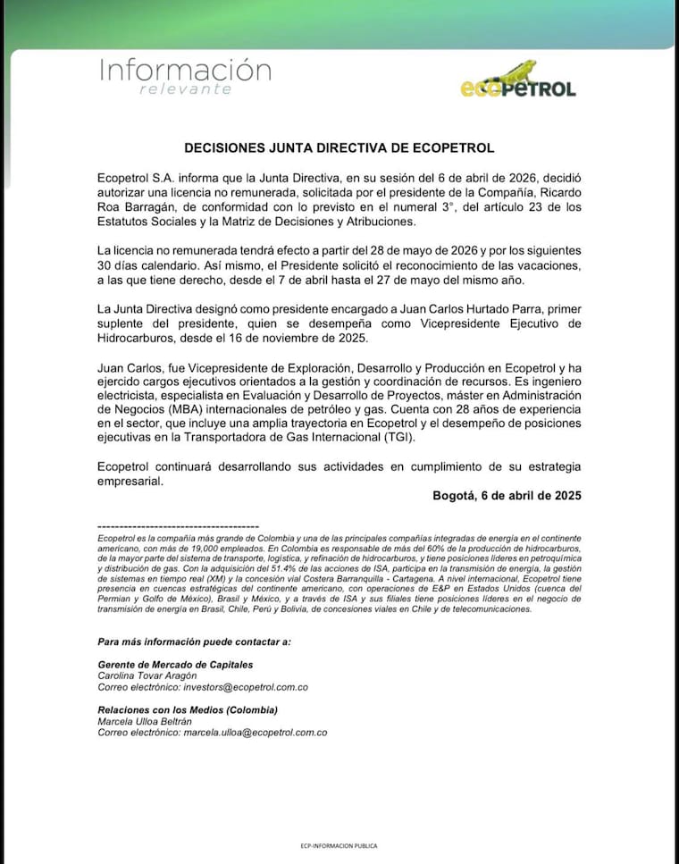 El reemplazo temporal de Roa será Juan Carlos Hurtado Parra, quien fue vicepresidente de Exploración, Desarrollo y Producción en Ecopetrol y ha ejercido cargos ejecutivos orientados a la gestión y coordinación de recursos.