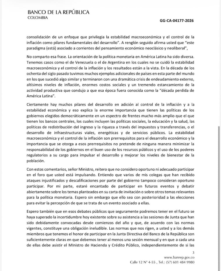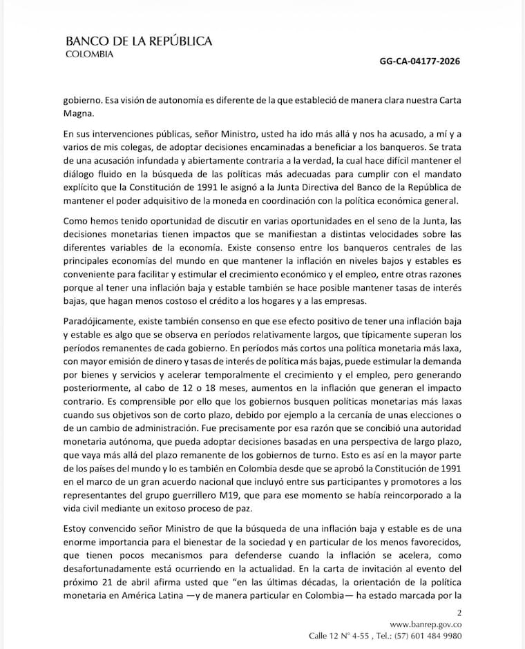 En la misiva, el directivo del Banco de la República lamenta que el tono del debate haya escalado a ataques personales. “Usted, señor Ministro, ha ido más allá y nos ha acusado, a mí y a varios de mis colegas, de adoptar decisiones encaminadas a beneficiar a los banqueros”, reza el texto.