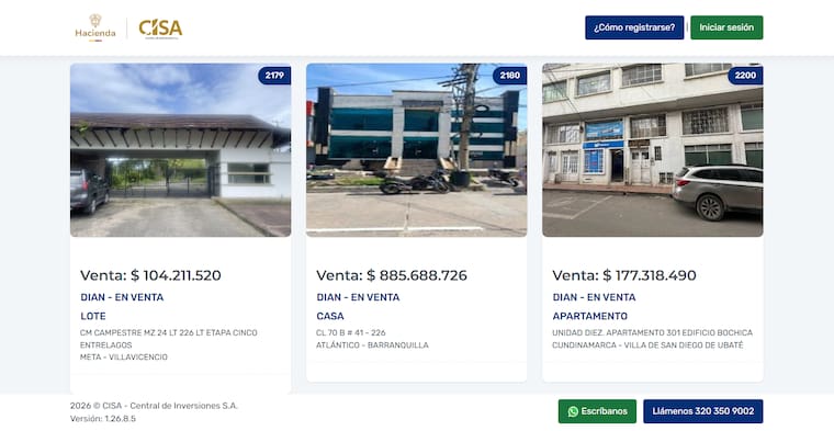 A través de la plataforma de la Central de Inversiones S.A. (Cisa) de Colombia, la Dirección de Impuestos y Aduanas Nacionales (Dian) ofrece en venta casas, apartamentos y locales comerciales en al menos diez ciudades y municipios.