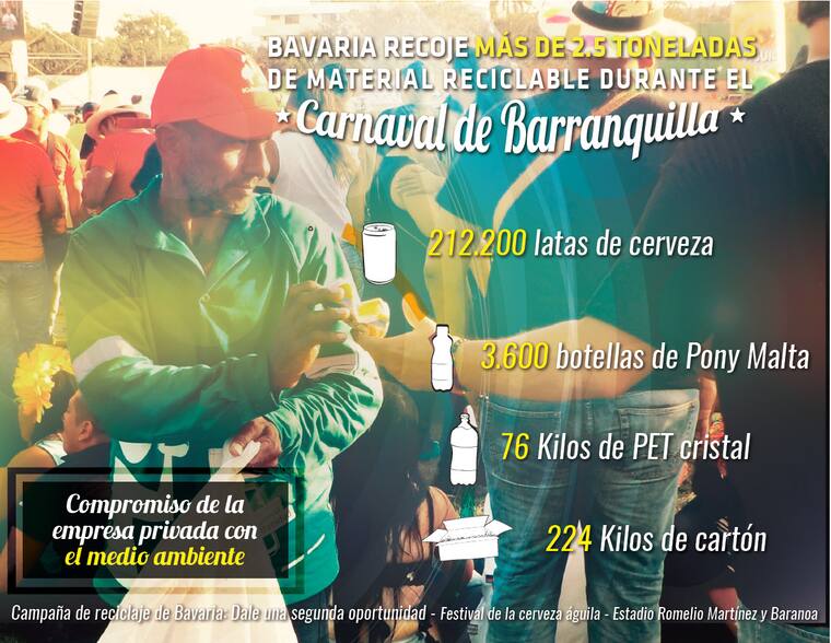 A través de la campaña ‘dale una segunda oportunidad’, Bavaria recogió 2,5 toneladas de material reciclable durante las fiestas de Carnaval. En línea a su compromiso con el medio ambiente y con la recolección de residuos durante las fiestas, que según Triple A fueron 496 toneladas, la cervecera incentiva a la utilización de los materiales.