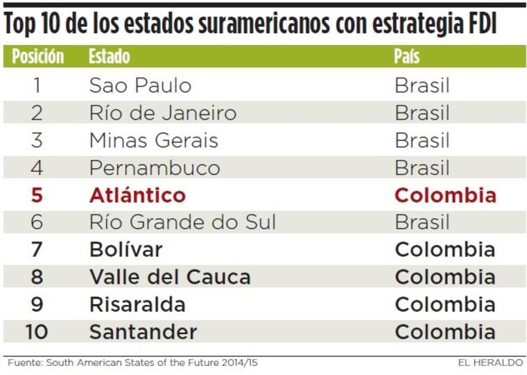 Atlántico fue ubicado en el puesto cinco del Top 10 de las regiones con mayor atractivo para atraer Inversión Extranjera Directa en América Latina en un reciente estudio elaborado por la división de inteligencia del diario económico londinense Financial Times.