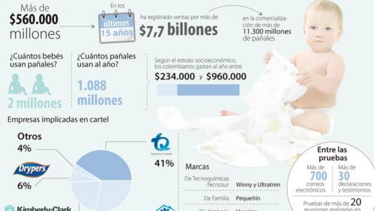 En el país son más de dos millones los bebés que utilizan unos 1.088 millones de pañales cada año, de los cuales 96% pertenece a marcas de las cinco empresas investigadas actualmente por cartelización empresarial: Tecnoquímicas-Tecnosur, con 41% de participación y las marcas Winny y Ultratrim; Familia, con una intervención de 28% y la marca Pequeñín; Kimberly, con participación del mercado de 21% y la marca Huggies; y Drypers, con intervención de 6% y la marca Baby Sec.