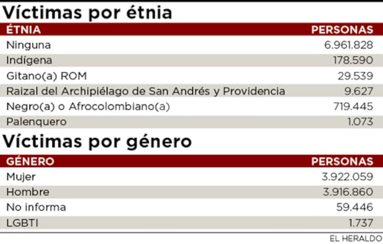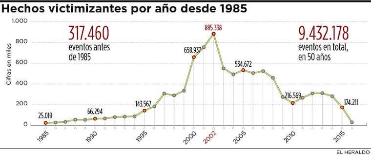 Pero se calcula que el conflicto armado en el país ha dejado en los últimos 50 años 8.190.451 víctimas, según el más reciente balance del Registro Único de Víctima (RUV), el cual hace parte de la Unidad de Reparación del Gobierno Nacional. Esta cifra es casi similar a la cantidad de habitantes que tuvo Colombia hacia 1938, cuando el censo oficial contó 8.697.041 habitantes.