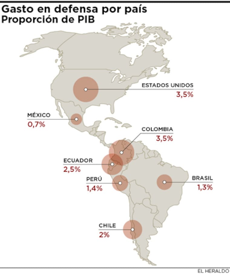 Los porcentajes podrían parecer pequeños frente a los montos totales: en 2016, Defensa y Policía se llevaron unos $29 billones de los $215 billones que conforman el PGN. Sin embargo, la cifra está a la par de la inversión que hace Estados Unidos (3,5% del PIB) y muy por encima de países como Ecuador (2,7%), Chile (2%), Perú (1,4%), Brasil (1,3%) y México (0,7%).