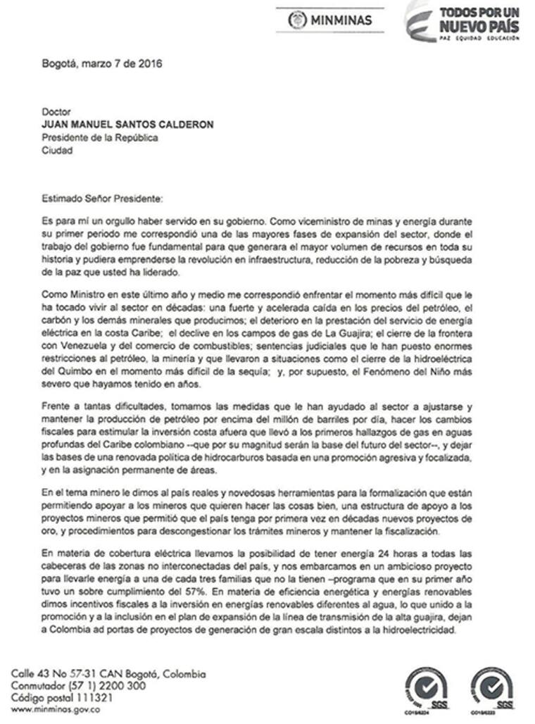 Así escribió Tomás González al presidente Juan Manuel Santos, en su carta de renuncia al Ministerio de Minas.