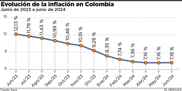 En este informe, que el Dane dio a conocer mediante el Índice de Precios al Consumidor (IPC), también tiene otra lectura, y es que aunque el nivel de inflación no sigue bajando, si se logró una caída de 4,95 puntos porcentuales en el sexto mes de este año si se compara con junio del año pasado cuando fue del 12,13 %.