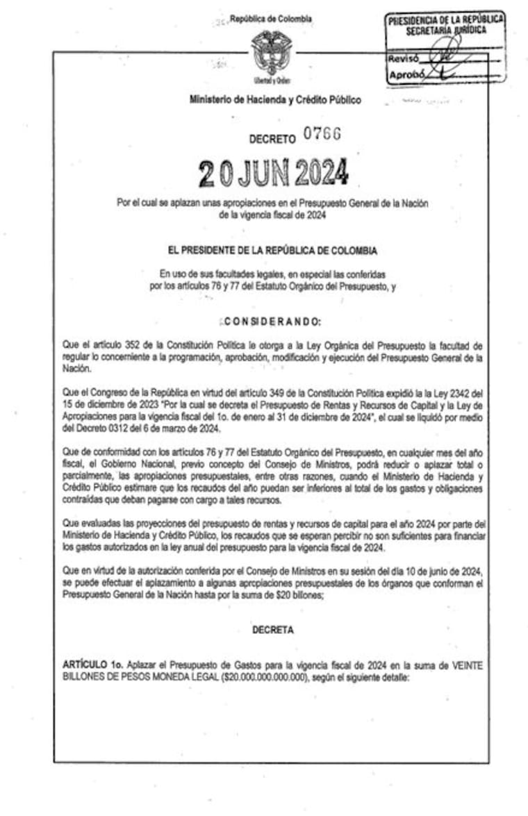 En el decreto firmado el 20 de junio se establece el recorte que impactará a todas las entidades involucradas, a algunas más que a otras. Sin embargo, todas tendrán un recorte, desde la Presidencia de la República hasta las superintendencias.