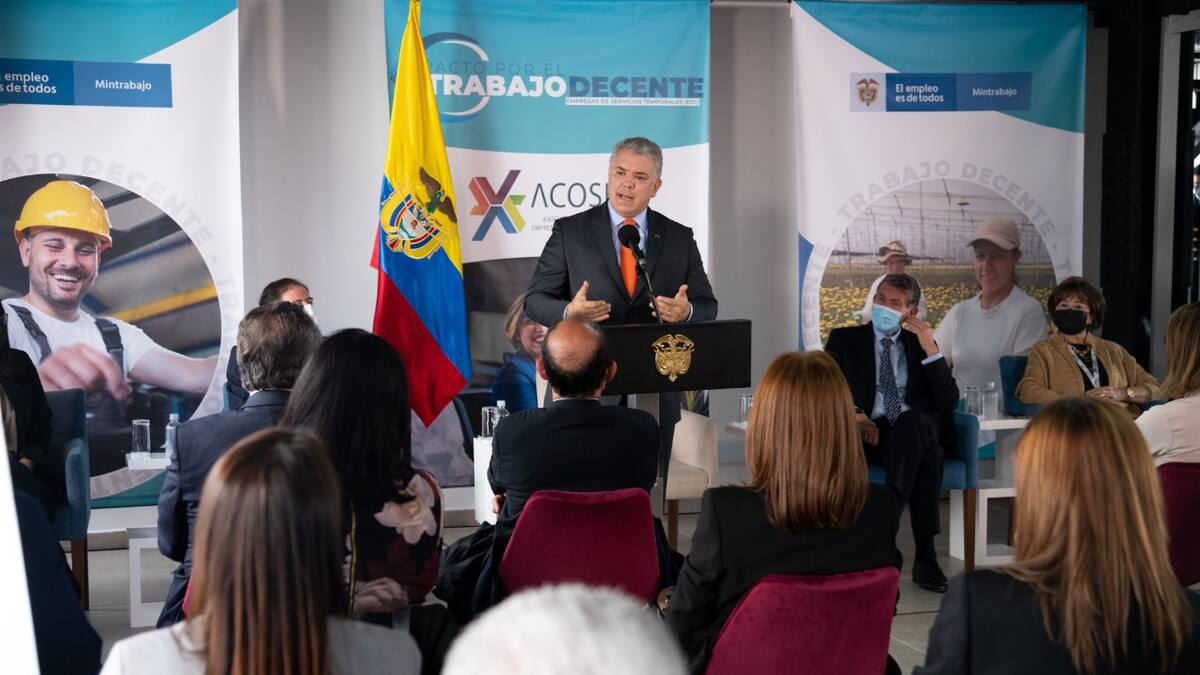 'Hoy estamos dándole el respeto, el lugar y reconocimiento a los servicios temporales e invitándolos a que sean parte de la revolución a la que estamos llamados a generar empleo rápido en el país, pero que sea parte de la base del trabajo decente', destacó el presidente Iván Duque durante su intervención.