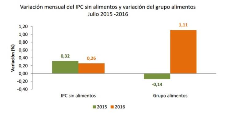 El grupo de gasto que registró la mayor variación mensual en el país fue alimentos con 1,11% (en julio de 2015 fue -0,14 %). Esto se explica por el menor abastecimiento de algunos alimentos durante las tres primeras semanas del mes de julio como consecuencia del paro de transporte de carga, tal y como se registró en el Sistema de Información de Precios, Sipsa*.