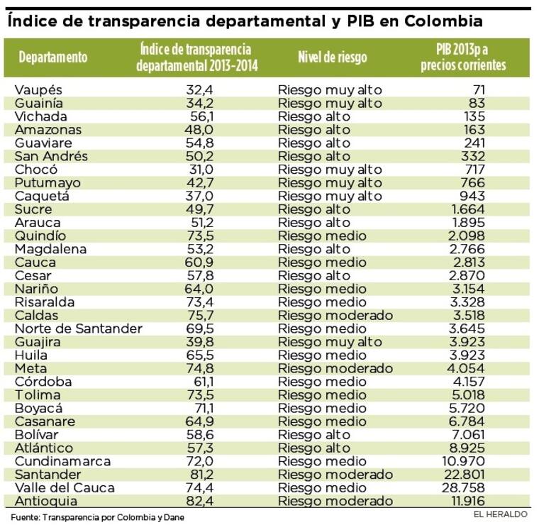 A nivel regional los departamentos con menor aporte el PIB nacional, presentan los mayores riesgos de corrupción. Por ejemplo, Vaupés, que tuvo un PIB de 71 mil millones en 2013, según el Dane, presentó un índice de 32,4 en la percepción de corrupción. Ocurre lo contrario para los departamentos con alto crecimiento económico como Antioquia, Valle del Cauca y Santander, que presentaron riesgos moderados y medios de corrupción, 82,4; 74,4; y 81,2 respectivamente.
