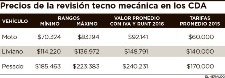 Con la aplicación del nuevo rango, las motocicletas deberán pagar en promedio unos $30 mil más de lo que pagaron el año pasado por la revisión (con el IVA y el Runt sin incluir los nuevos cobros), mientras que el aumento para los vehículos livianos puede estar en el orden de los $8 mil y para los vehículos pesados en $70 mil.
