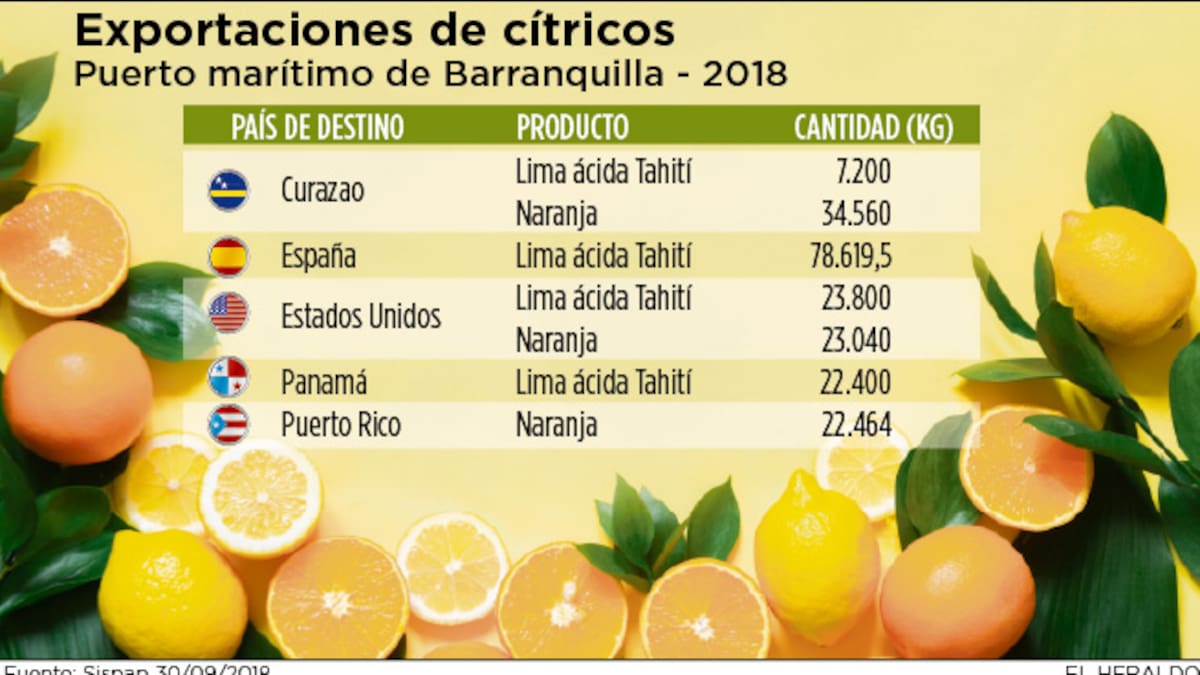 El Puerto de Barranquilla es el muelle de Colombia para exportar cítricos dulces. Entre enero y septiembre de este año fueron embarcadas hacia cinco destinos internacionales 212,08 toneladas de cítricos de limón tahití y naranja, según el Sistema de Información Sanitaria para Importación y Exportación de Productos Agrícolas y Pecuarios (Sispa).