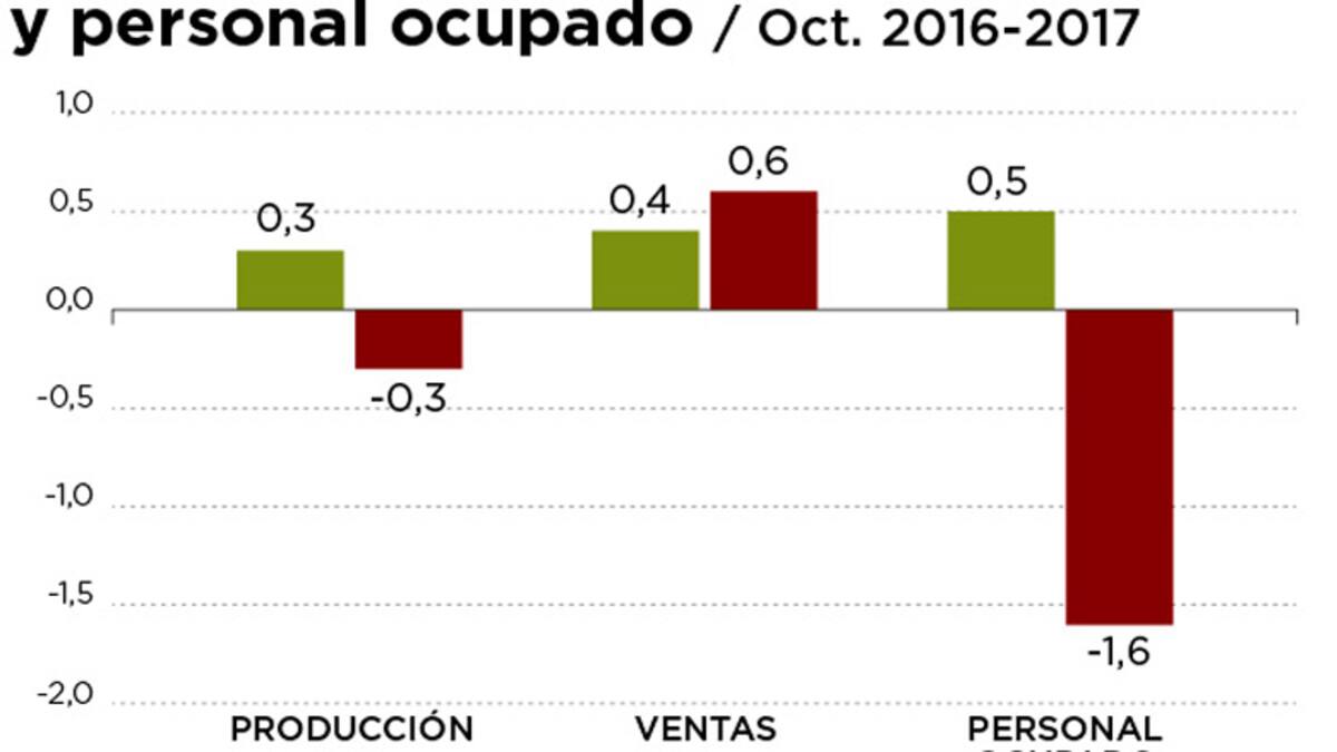 Al analizar los datos de octubre, la variación anual de la producción real de la industria fue negativa en un 0,3%, igual que el personal ocupado en 1,6%, mientras que las ventas crecieron 0,6%, debido al aumento de pedidos anticipados para cubrir la demanda de fin de año.