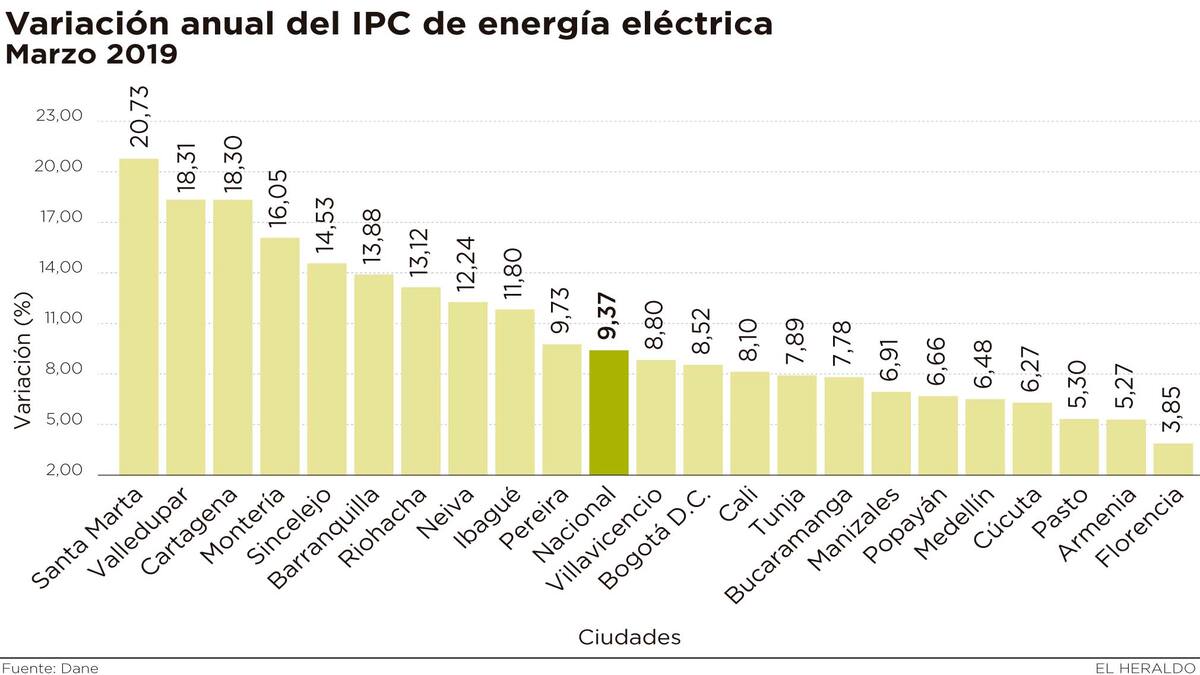 Al analizar el periodo comprendido entre marzo de 2018 y marzo de 2019, el Dane indica que la variación anual del IPC de energía eléctrica para el país fue de 9,37%, mientras que en Santa Marta fue de 20,73%, la más elevada; seguida de Valledupar con 18,31%, Cartagena con 18,30%, Montería con 14,53%, Sincelejo con 14,53%, Barranquilla con 13,88% y Riohacha con 13,12%.