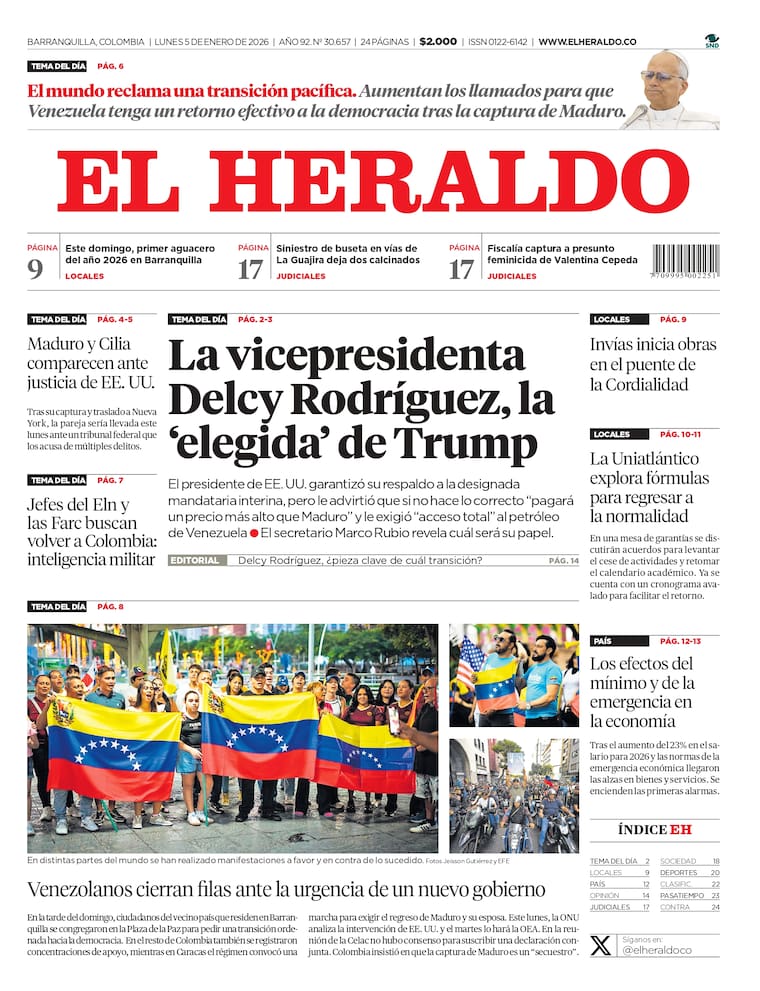 ContáctenosPortada y contraportada de EL HERALDO del lunes 5 de enero de 2026.