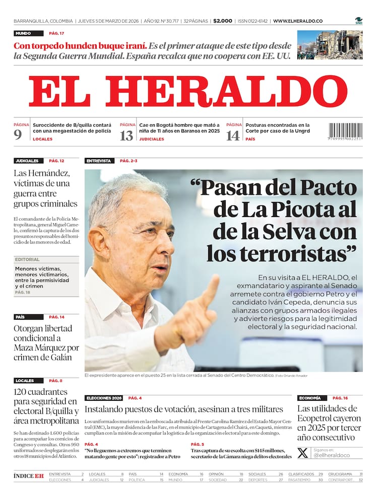 ContáctenosPortada y contraportada de EL HERALDO del jueves 5 de marzo de 2026.