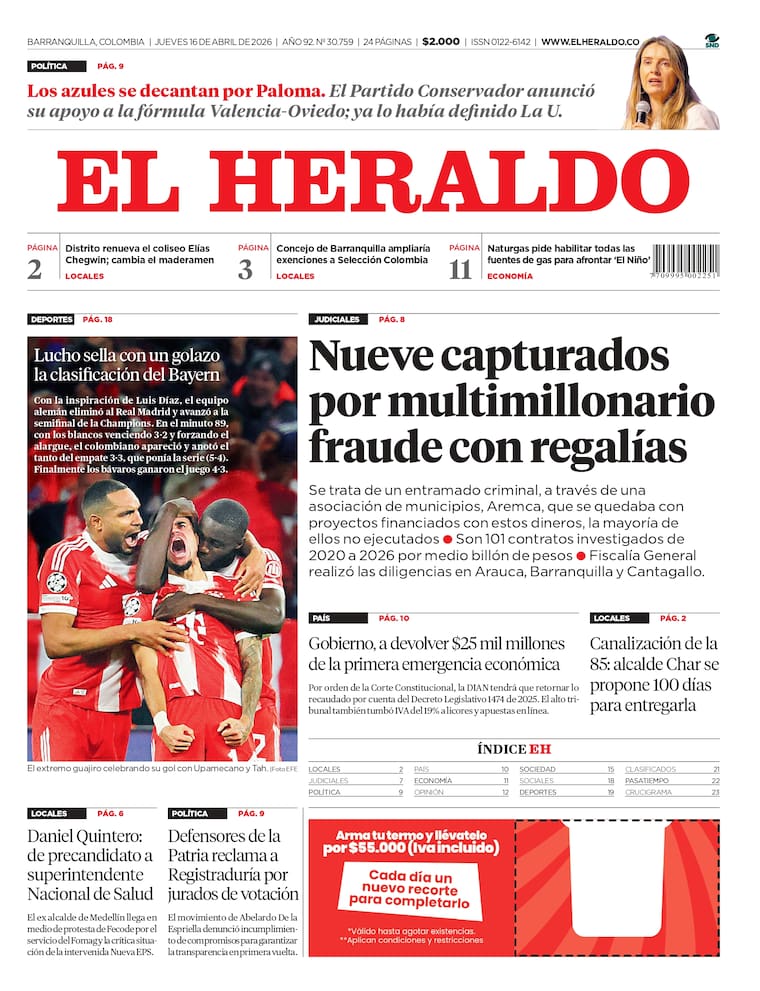 ContáctenosEdición impresa del jueves 16 de abril de 2026.