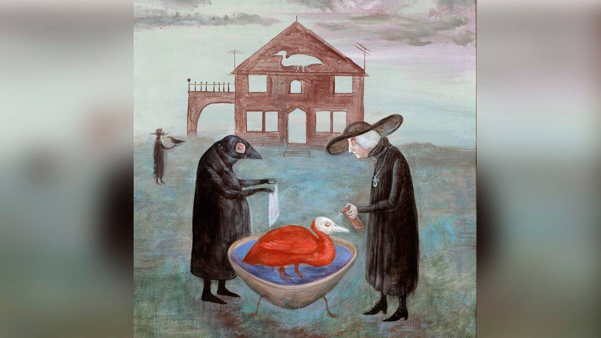 El escenario es claro: el cielo se torna de un rosa pálido y de un gris que lo apaga; lo primero que capta tu atención es el hecho de que dos personas de sexo indefinido con trajes parecidos a los de un cuervo –una con la cara cubierta y la otra con un amuleto colgando del cuello que simula un ángel o probablemente un ave también– bañen con suma paciencia a un pájaro que con entereza reposa en una vasija semiesférica; al fondo se aprecia una enorme casa (tal vez un santuario), bastante vieja pero bien cuidada, con la imagen sobresaliente de la silueta de un ave, para variar; a la izquierda de la casa, se halla otro de estos seres extraños, sosteniendo encantado otra ave, mirándola fijamente con esa especie de ornitomanía que aqueja a todo habitante de este paisaje surreal.