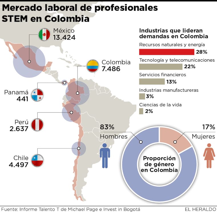 Entretanto, el informe ‘Talento IT: la era STEM 5.0 llega a América Latina’ indicó que en la región hay más de 70.000 profesionales STEM; Brasil cuenta con 30.942, seguido de México con 13.424, en el tercer lugar está Argentina con 10.307 y en la cuarta posición está Colombia con 7.486 profesionales. Además, el estudio resalta que estos cuatro países coinciden “con una demanda de contratación muy alta”.