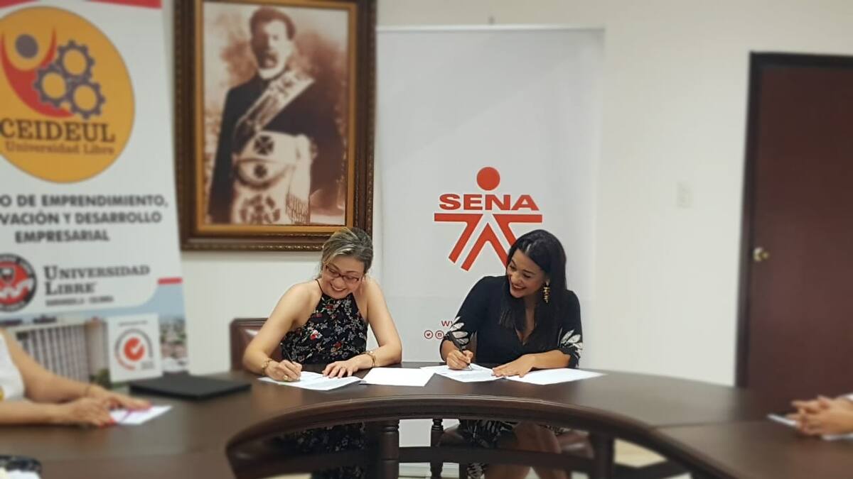La firma del convenio se llevó a cabo en la Sala de Juntas de Presidencia de la Universidad Libre Seccional Barranquilla y contó con la participación de la Dra. Jacqueline Rojas Solano, Directora Regional del Sena; la Dra. Beatriz Tovar Carrasquilla, Presidente Delegada de la Universidad Libre; La Dra. Carmen Daza, Subdirectora (e) Cedrago y Coordinadora de formación del Centro de Comercio y Servicios; la Dra. Luz Elena Álvarez, Líder de Emprendimiento del Sena.