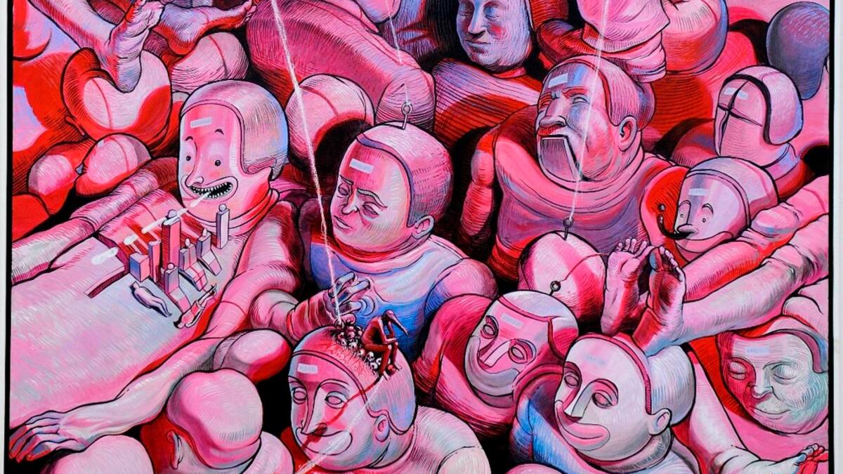 La hibridación entre humanos y animales, o entre humanos y máquinas, se usa para representar con mayor vigor escenas en que apreciamos estados y circunstancias sociales de opresión, sometimiento, manipulación y control. Unos seres se ven utilizando a otros como ‹Puntos de apoyo› –tal como irónicamente se titula uno de los cuadros–, lo que no es otra cosa que la acción desaprensiva mediante la cual los poderosos pasan por encima de los demás, atropellándolos y humillándolos, para lograr sus mezquinos objetivos. (Por cierto, ese cuadro que se titula «Puntos de apoyo» es uno de los más soberbios de Alonso, y evoca la Reunión de 35 cabezas de expresión, del francés Louis Léopold Boilly).