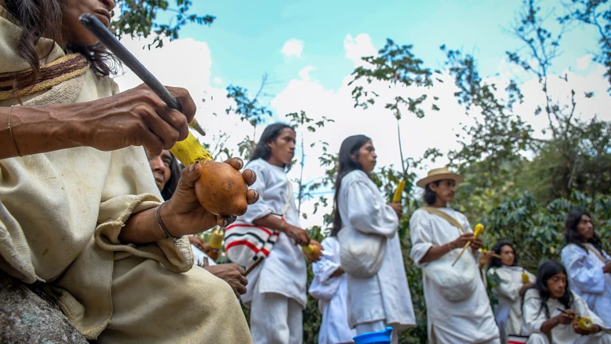 A medida que transcurre el ritual, varios de los hombres kogui tienen en sus manos el tradicional poporo, objeto cuya base es un calabazo que en su interior tiene ralladura de concha de nácar.