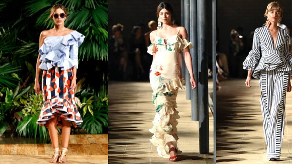 Las rayas se evidenciaron en tonos azules en vestidos, faldas y camisas de mangas largas, y algunos pantalones. Flores y hojas de árboles se observaron en tonos claros como el nude.