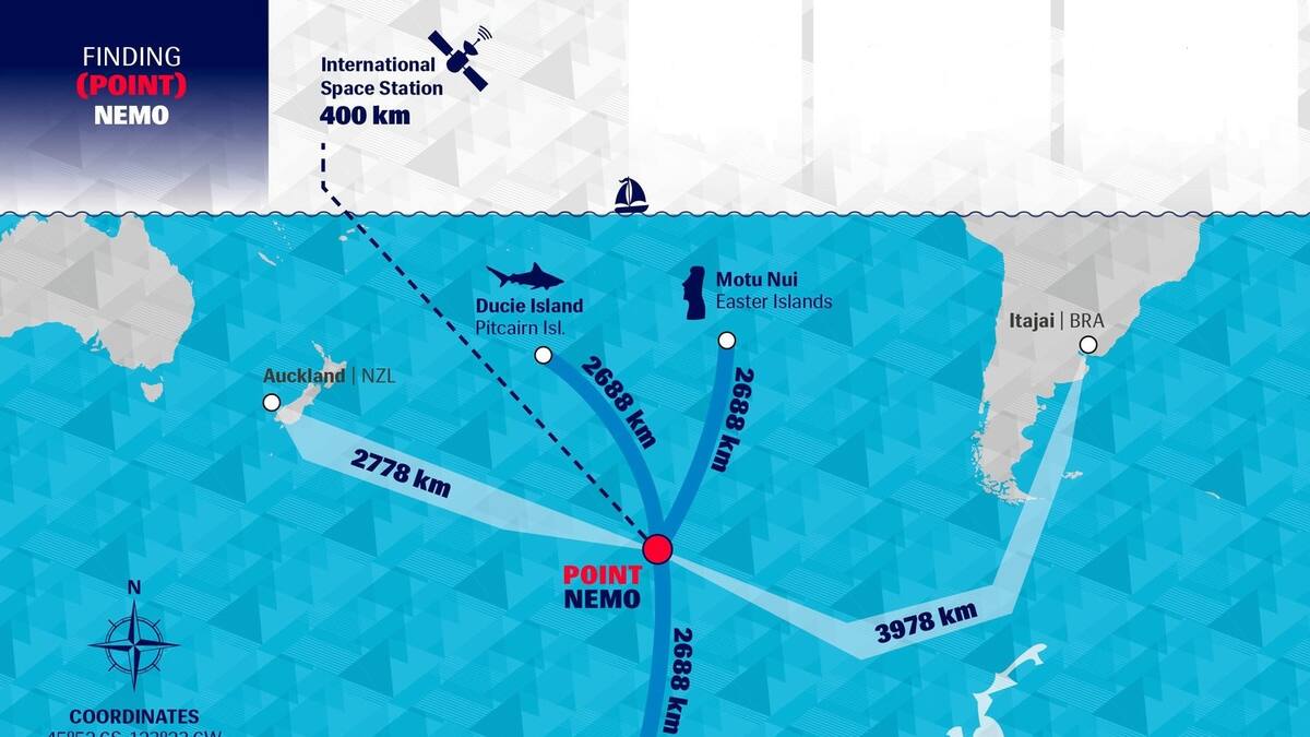 El Punto Nemo –apodado así por el personaje del escritor Julio Verne que aparece en sus novelas Veinte mil leguas de viaje submarino y La isla misteriosa– está paralelamente localizado entre las costas de cinco islas: