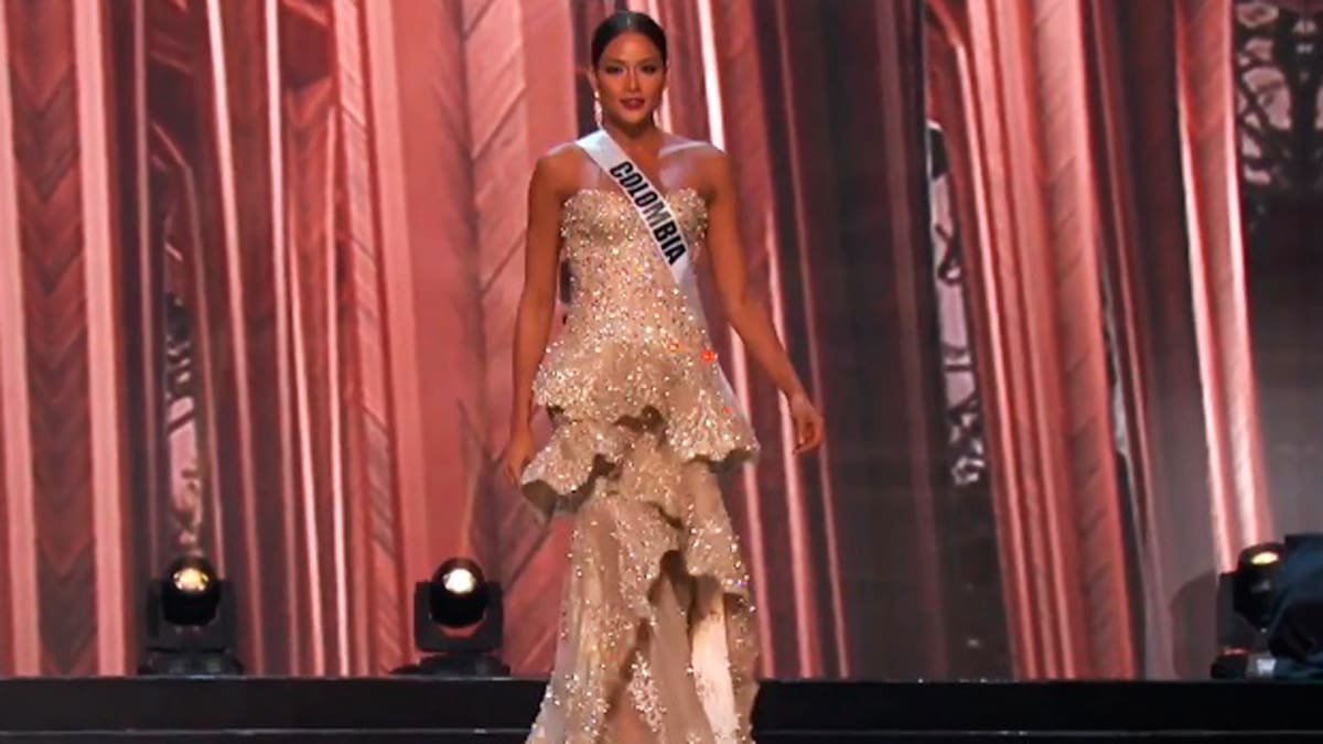 Durante el desfile del traje de noche, Andrea lució un diseño tipo strapless en color beige impregnado de brillantes que le resaltaba su tono de piel canela.