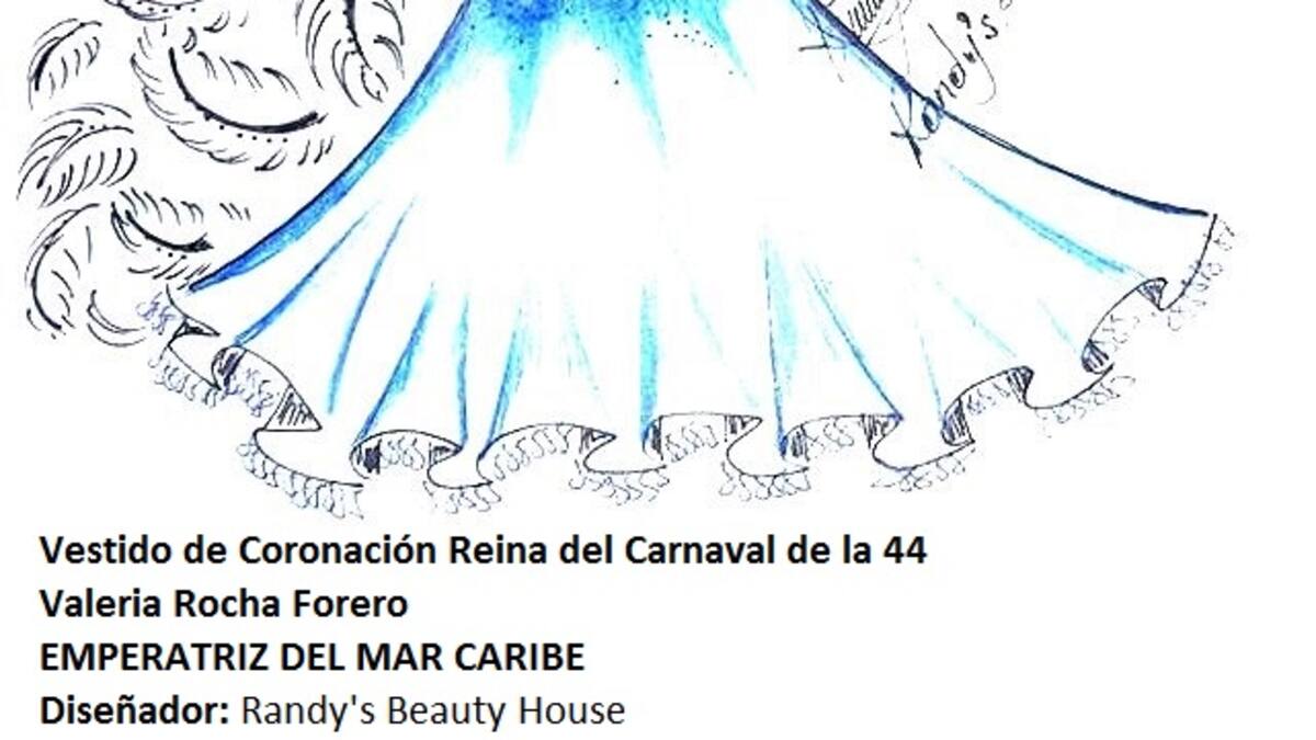 Silueteado al cuerpo y de cola amplia es el vestido blanco con azul que lucirá Valerie Rocha Forero, reina del Carnaval de la 44, en su coronación, que se llevará a cabo hoy en la Plaza de la Paz. Un espaldar de plumas con un sol en su centro completa el diseño ‘Emperatriz del mar Caribe’, creado por Randy’s Beauty House.