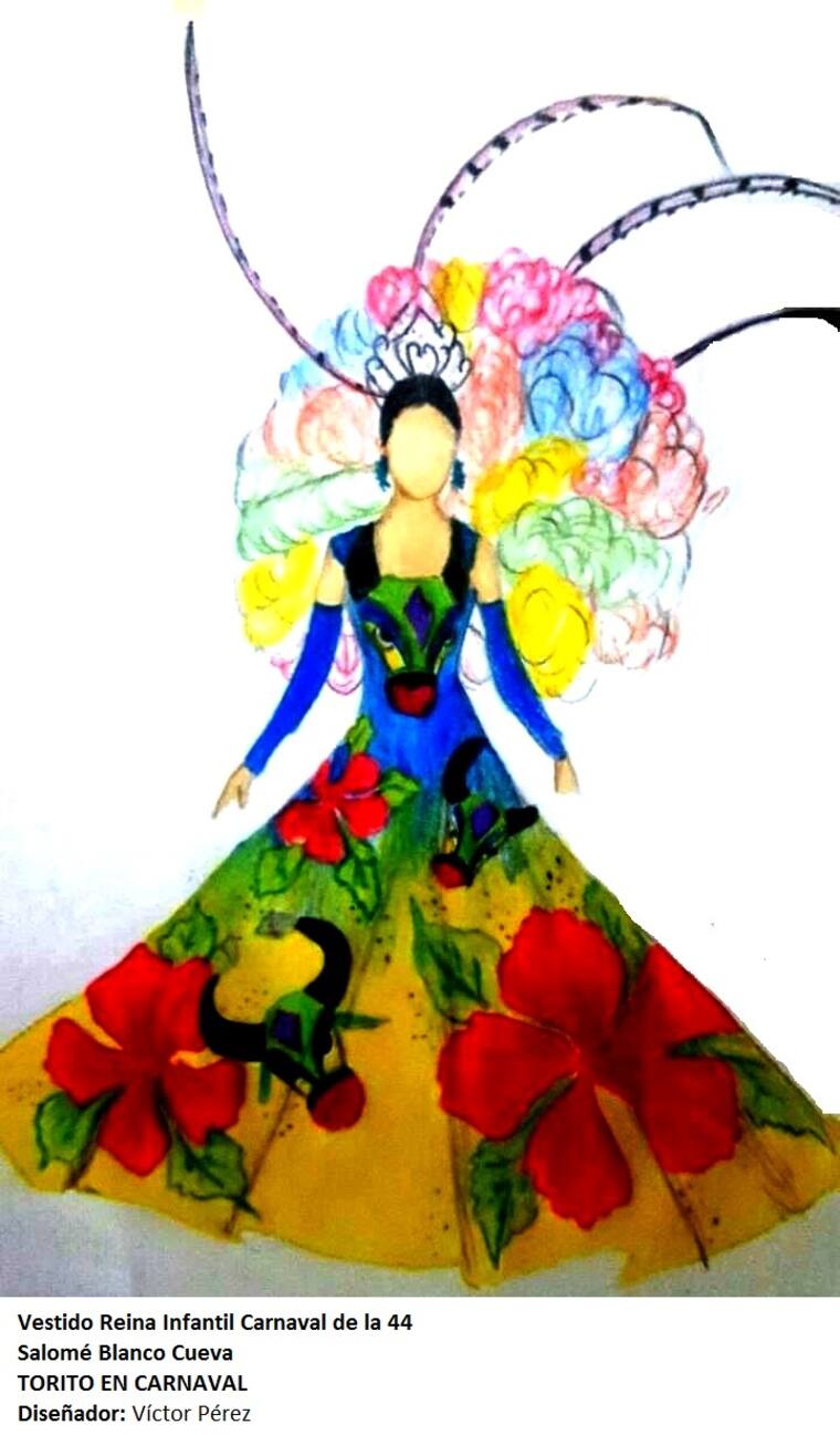 Por su parte, la reina infantil Salomé Blanco Cueva presentó también su traje de coronación. Un vestido con alusión al Torito, disfraz tradicional de las fiestas, en un fondo amarillo y azul donde sobresalen unas flores rojas, y un espaldar de colores. El diseñador del traje, Víctor Pérez, llamó a su creación ‘Torito en Carnaval’.