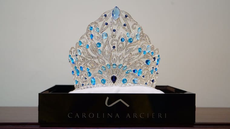 Se trata de una pieza diseñada y realizada en los talleres de la joyera Carolina Arcieri. El accesorio pesa 800 gramos y está fundido en plata de ley 925. Además, cuenta con más de 900 quilates en piedras semipreciosas naturales de diferentes tamaños y tonalidades de azules finamente acompañadas por zirconias suizas encargadas de otorgarle el brillo a la corona.