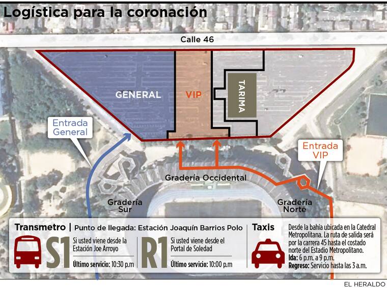 Las puertas para entrar al parqueadero del Estadio Metropolitano estarán abiertas desde las 5 de la tarde para que el público pueda ubicarse desde tempranas horas y apreciar el espectáculo de coronación, el cual iniciará a las 8:30 de la noche en vivo y en directo por el canal regional Telecaribe. Las personas que viven fuera de la ciudad y el país podrán verlo vía streaming por la APP del Carnaval 2017.