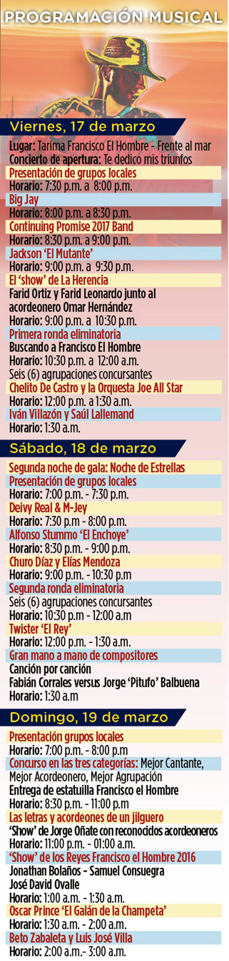 Habrá eventos simultáneos como el festival Buscando a Francisco el Hombre Juvenil hoy y mañana a un costado del muelle, en la Avenida Primera. Un desfile cívico y cultural se une a la programación con distintas comparsas de la región, hoy desde las tres de la tarde, y parte desde el aeropuerto Almirante Padilla.