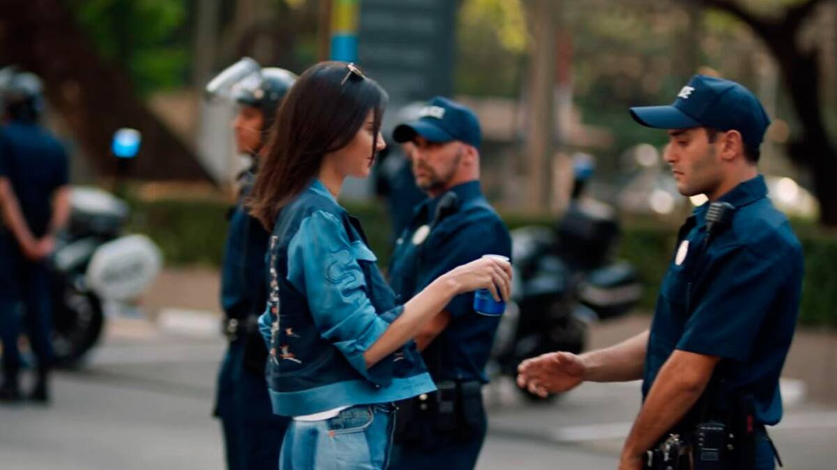 En la publicidad de la bebida gaseosa, Jenner participa en una sesión fotográfica antes de unirse a una protesta callejera y ofrecer una Pepsi a uno de los policías presentes.