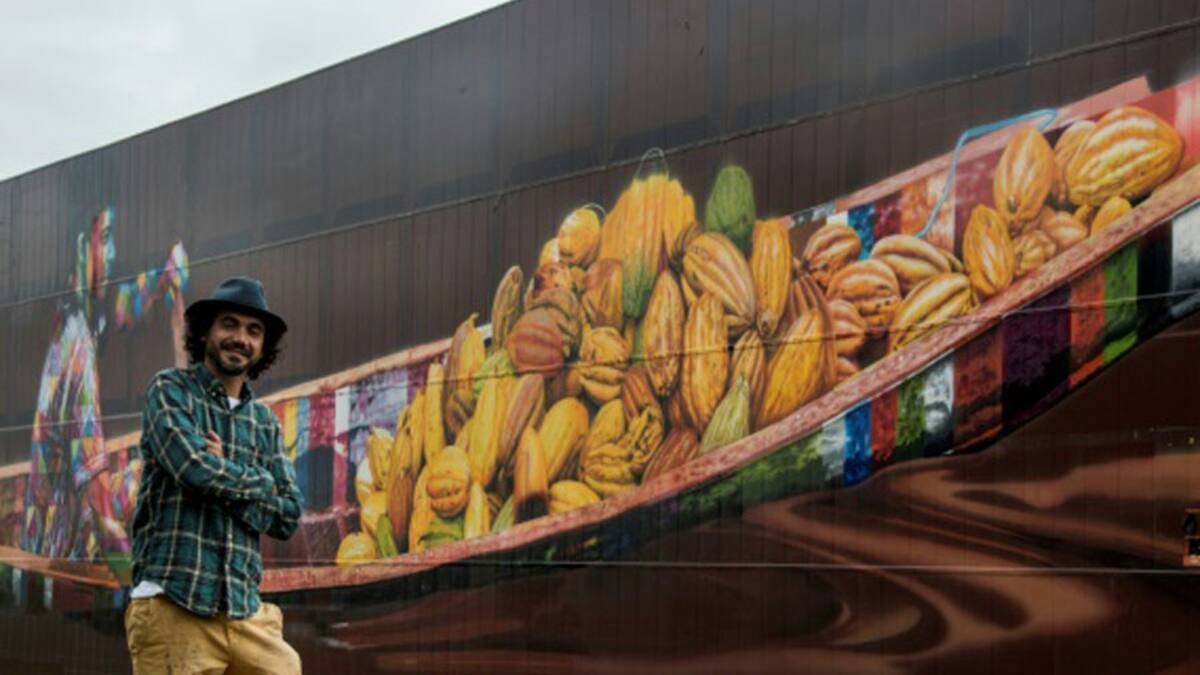 El grafiti representa a un joven indígena de la Amazonía que rema en una piragua cargada de cacao, en medio de un río de chocolate.