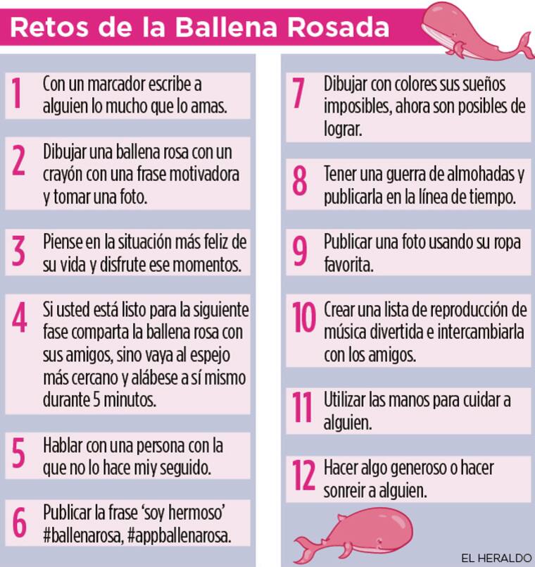 Según sus creadores, la idea de ‘La ballena rosa’ es erigir una cadena mundial de buenas acciones. Retos como escribirle a alguien con un marcador en alguna parte de su cuerpo lo mucho que lo amas, hacer algo generoso, pensar en la situación más feliz que se ha vivido, hacerse buenas críticas frente al espejo, hablar con personas que no se hable muy seguido y ayudar a alguien son algunas de las tareas que propone este movimiento desde sus redes sociales, y desde su ‘app’ que ya está disponible para IOS y Android.