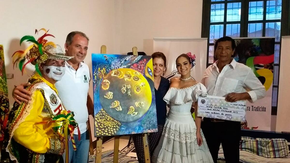El artista plástico Jaime Castillo Ríos, con su obra en acrílico sobre lienzo, 'Meneando la Luna', fue el ganador de la ilustración del afiche del Carnaval 2018 y de un cheque de cinco millones de pesos, que recibió de manos de la Reina del Carnaval de Barranquilla, Valería Abuchaibe Rosales.